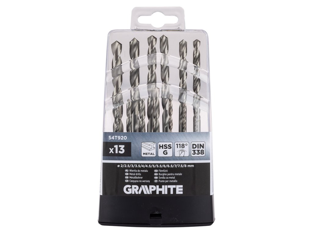 Vrtáky do kovu HSS-G, 2 - 8 mm, sada 13 kusů, 54T920 od společnosti GRAPHITE jsou vrtáky do kovu o průměrech 2, 2,5, 3, 3,5, 4, 4,5, 5, 5,5, 6, 6,5, 7, 7,5, 8 mm. Jsou vyrobeny z rychlořezné oceli HSS-G. Mají válcovou stopku a úhel hrotu vrtáku 118°. Odpovídají normě DIN 338 a jsou vhodné pro každého kutila.Doplňkové parametry