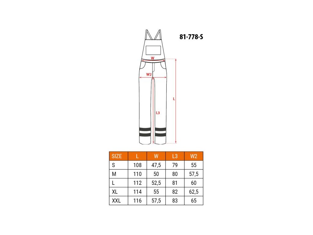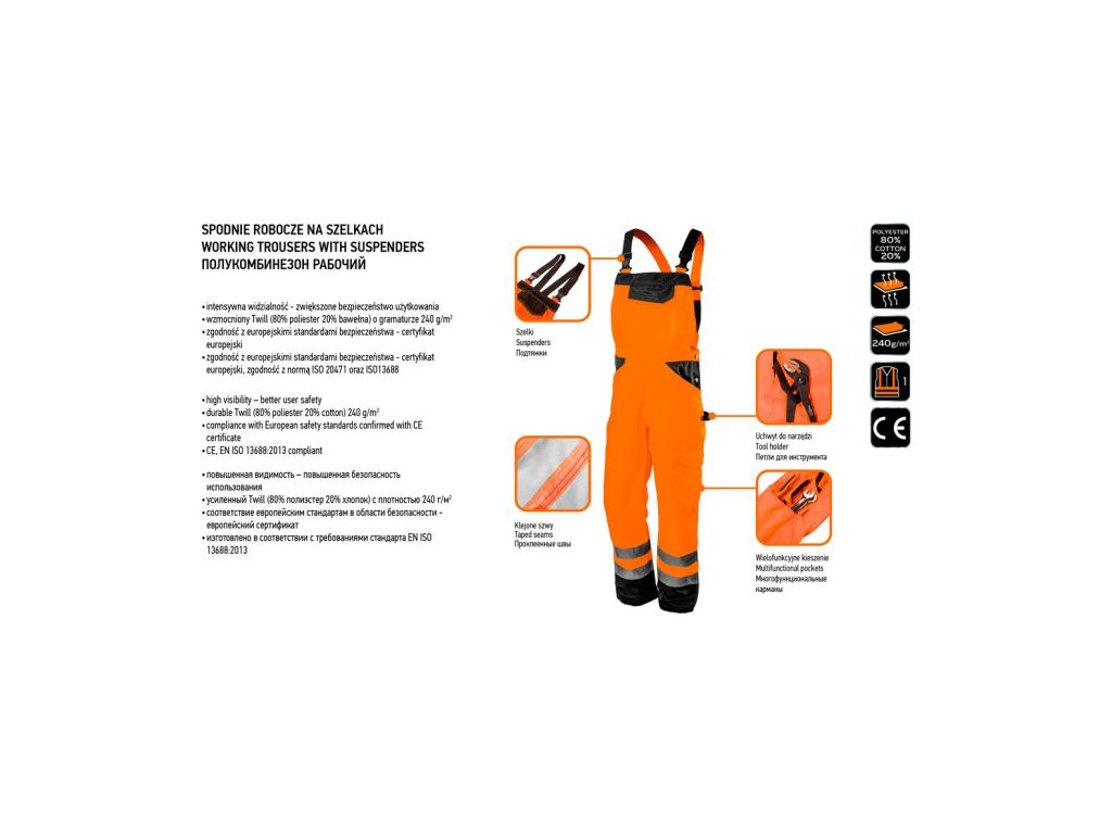 NEO pracovní kalhotky s náprsenkou (81-778-L) vysoké viditelnosti jsou praktickým řešením, které zvyšuje bezpečnost uživatele signalizací přítomnosti za všech světelných podmínek, za denního světla nebo ve tmě s umělým světlem, při osvětlení např. svítilnami vozidla.