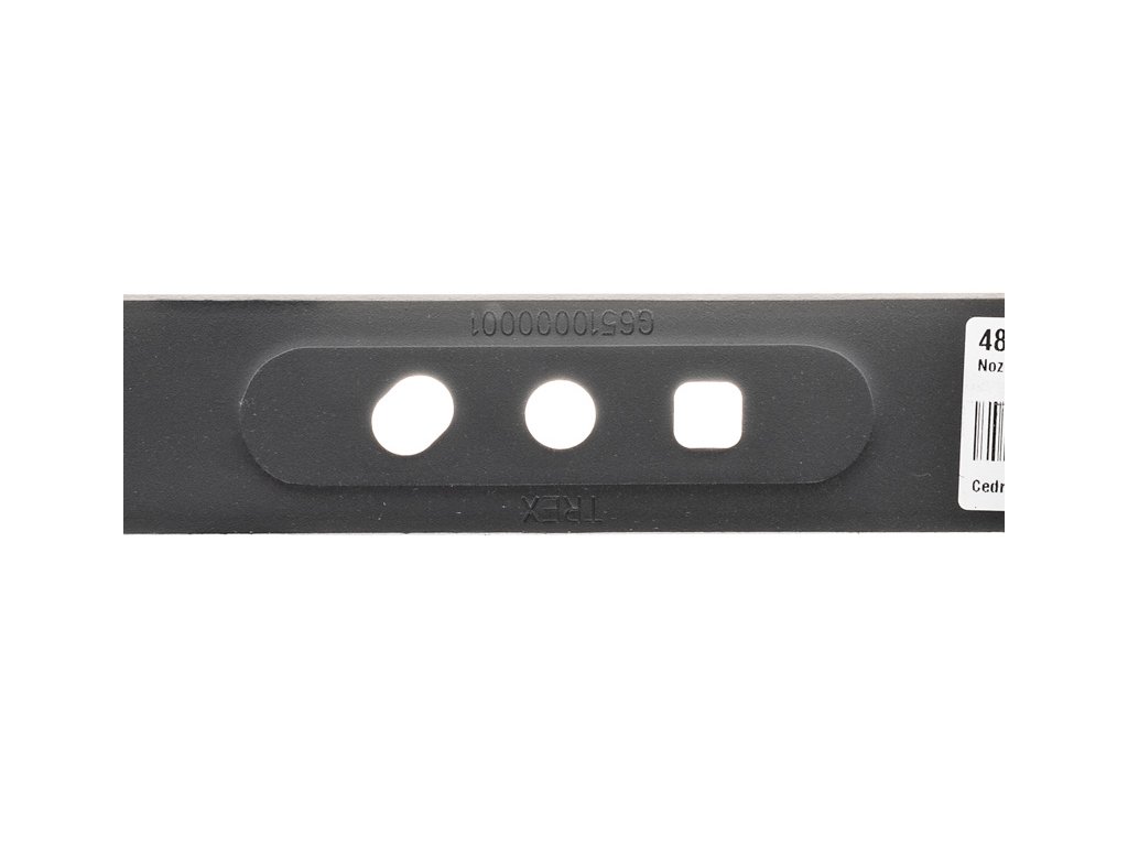 S délkou 525 mm poskytuje nůž široký záběr a je ideální pro sečení velkých travnatých ploch. Disponuje centrálním montážním otvorem o průměru 14 mm a dvěma bočními montážními otvory – oválným 13,5 × 17,5 mm a čtvercovým 13,5 × 13,5 mm, vzdálenými 60 mm od sebe (střed–střed).