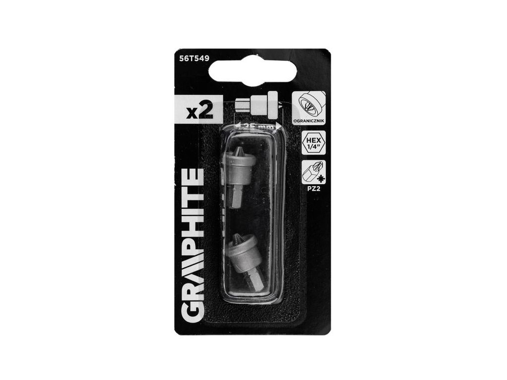 Sada dorazových bitů GRAPHITE (PZ2 × 25 mm, 2 ks, 56T549) je určena pro přesné a bezpečné šroubování. Díky hloubkovému dorazu umožňuje kontrolovat hloubku zašroubování a chránit tak povrch materiálu před poškozením.