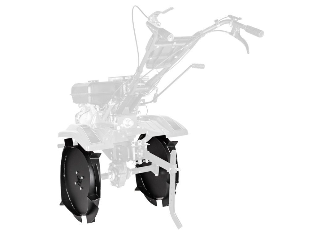 - Konstrukce kol zahrnuje 6 robustních ocelových lopatek, které se zařezávají do půdy a zabraňují prokluzu, i při práci ve vlhké nebo jílovité půdě. Kola mají plný disk, což přispívá k odolnosti a dlouhé životnosti.