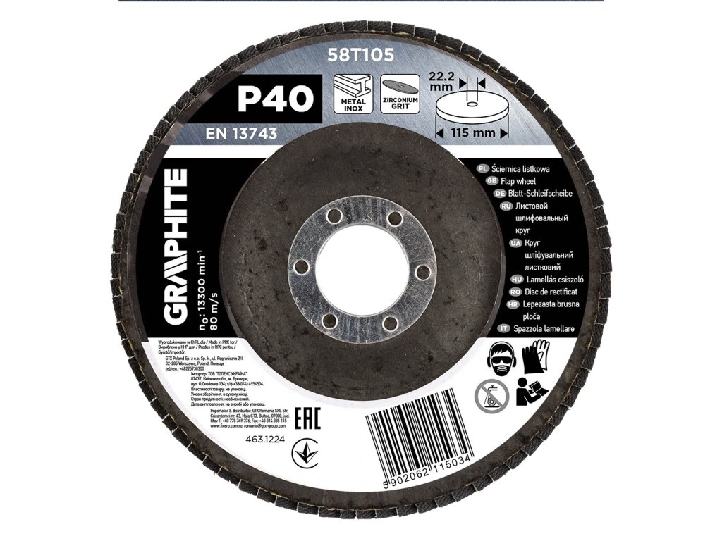 Zirkonový lamelový kotouč GRAPHITE (115 × 22,2 mm, P40, 58T105) je určen pro hrubší broušení kovů s vysokou účinností. Vějířovitě uspořádané listy ze zirkonového zrna umožňují rychlý úběr materiálu, dlouhou životnost a stabilní výkon i při intenzivním zatížení.