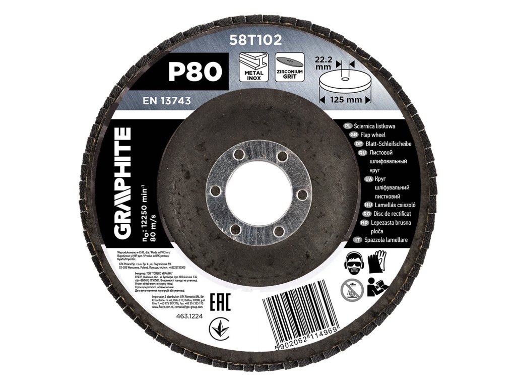 Zirkonový lamelový kotouč GRAPHITE 58T102 je určen pro profesionální i hobby broušení kovových materiálů. Díky rozměrům 125 × 22,2 mm a zrnitosti P80 je ideální pro broušení běžné i nerezové oceli, korozivzdorných a kyselinovzdorných materiálů.