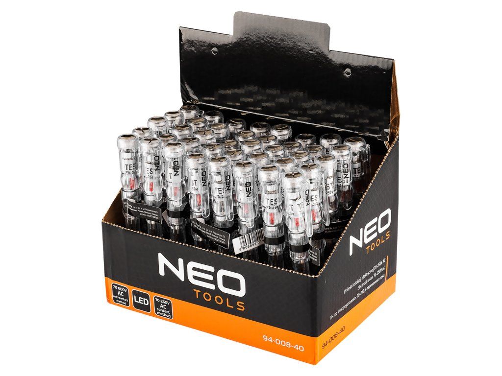 Zkoušečka elektrických instalací 70-250 V AC, 40 ks od NEO TOOLS je zkoušečka elektrických instalací pro rychlé a bezpečné ověření přítomnosti napětí v elektrických obvodech a instalacích. Bez nutnosti kontaktu s vodičem (bezkontaktní funkce) nebo přímou sondou pro přesné měření.